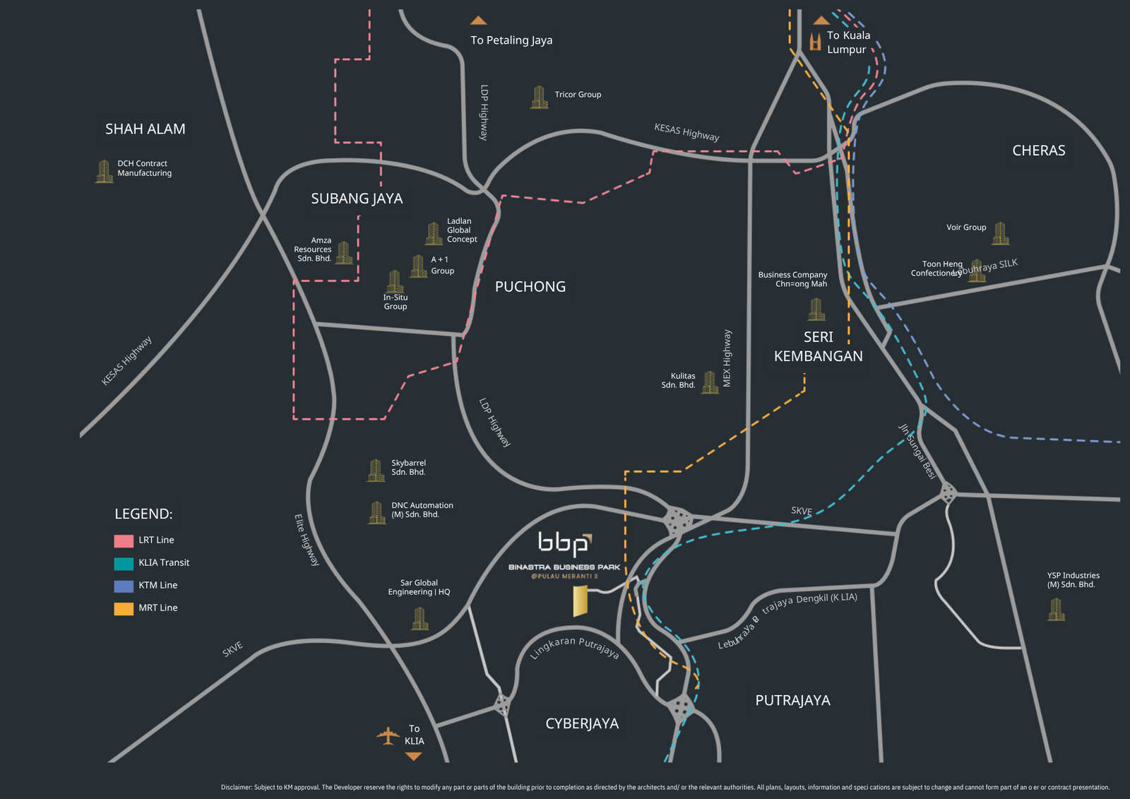 Binastra Business Park connects directly to major highways SKVE, ELITE, and MEX. This gives you fast access to Cyberjaya, Putrajaya, and Seri Kembangan. The park sits close to KLIA airport, perfect for businesses that need quick flights out.